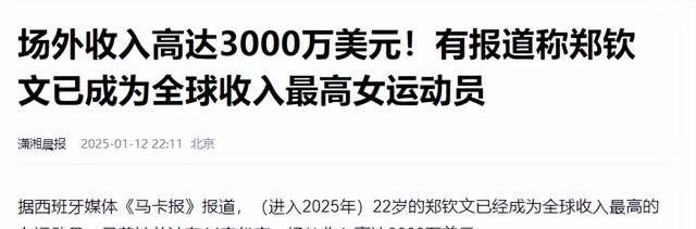 昨日国际著名媒体《马卡报》对我国的网球敞开员郑钦文作了有关报说念,报说念试验不仅对她的身价作念了有关分析,郑钦文的场外收入高达3000万好意思元,折合成东说念主民币即是2.2亿。