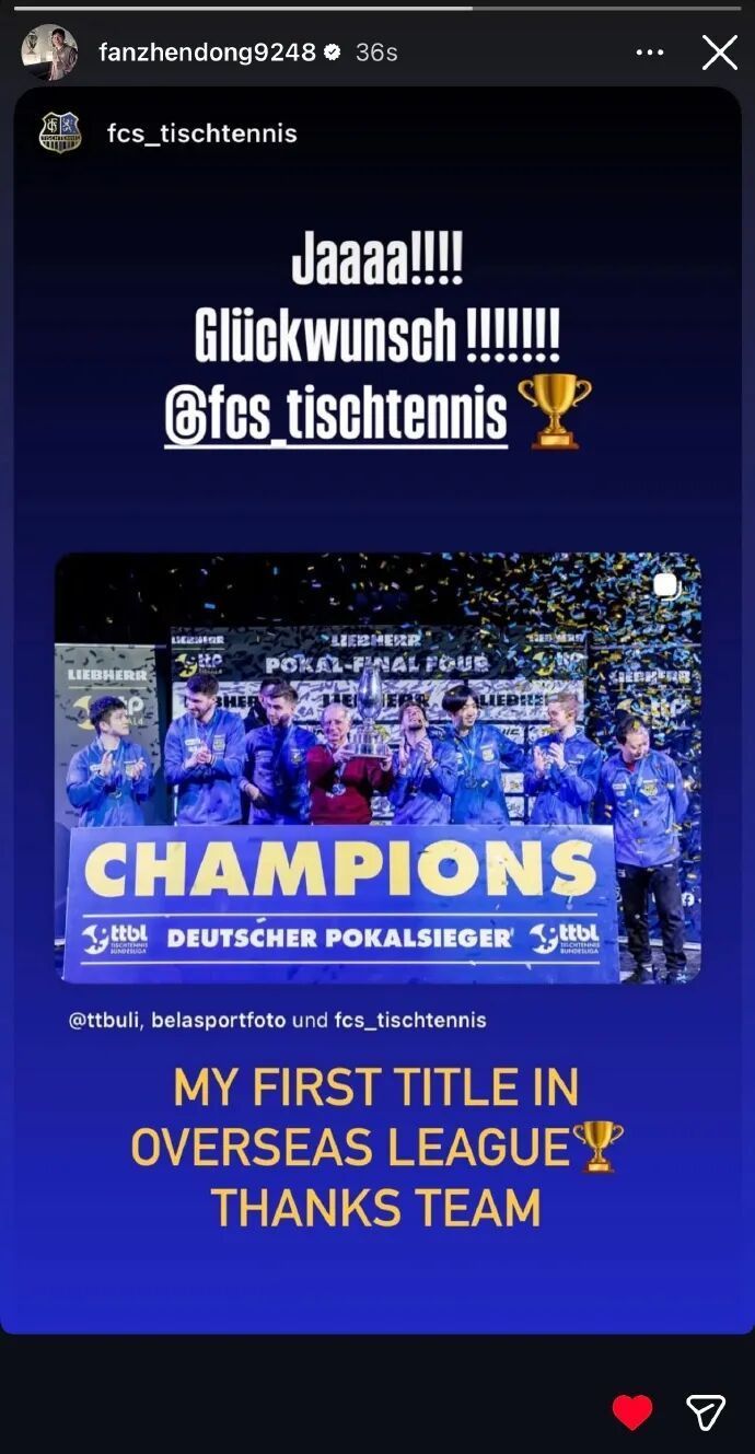 樊振东更新社媒晒照:留洋生活第一个冠军,感谢球队。