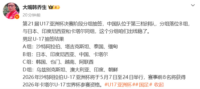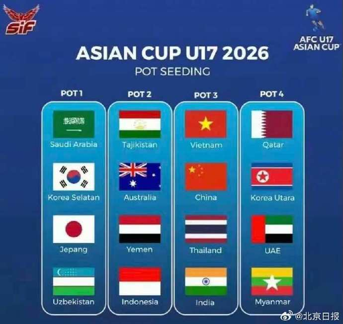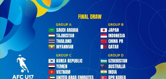 动作第三档球队,U17国足与日本、印度尼西亚和卡塔尔分入同组。