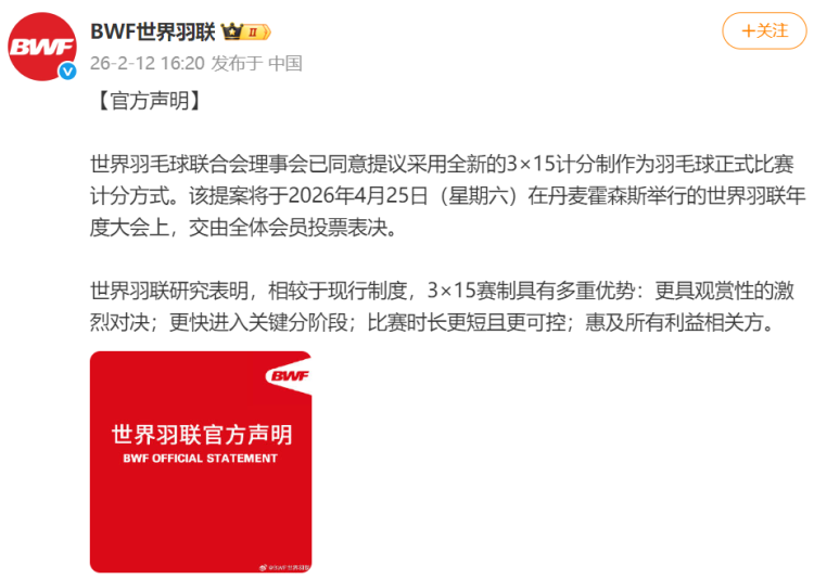 宇宙羽毛球逢迎会理事会已得意淡薄接收全新的3×15计分制算作羽毛球认真比赛计分面容。该提案将于2026年4月25日(星期六)在丹麦霍森斯举行的宇宙羽联年度大会上,交由举座会员投票表决。